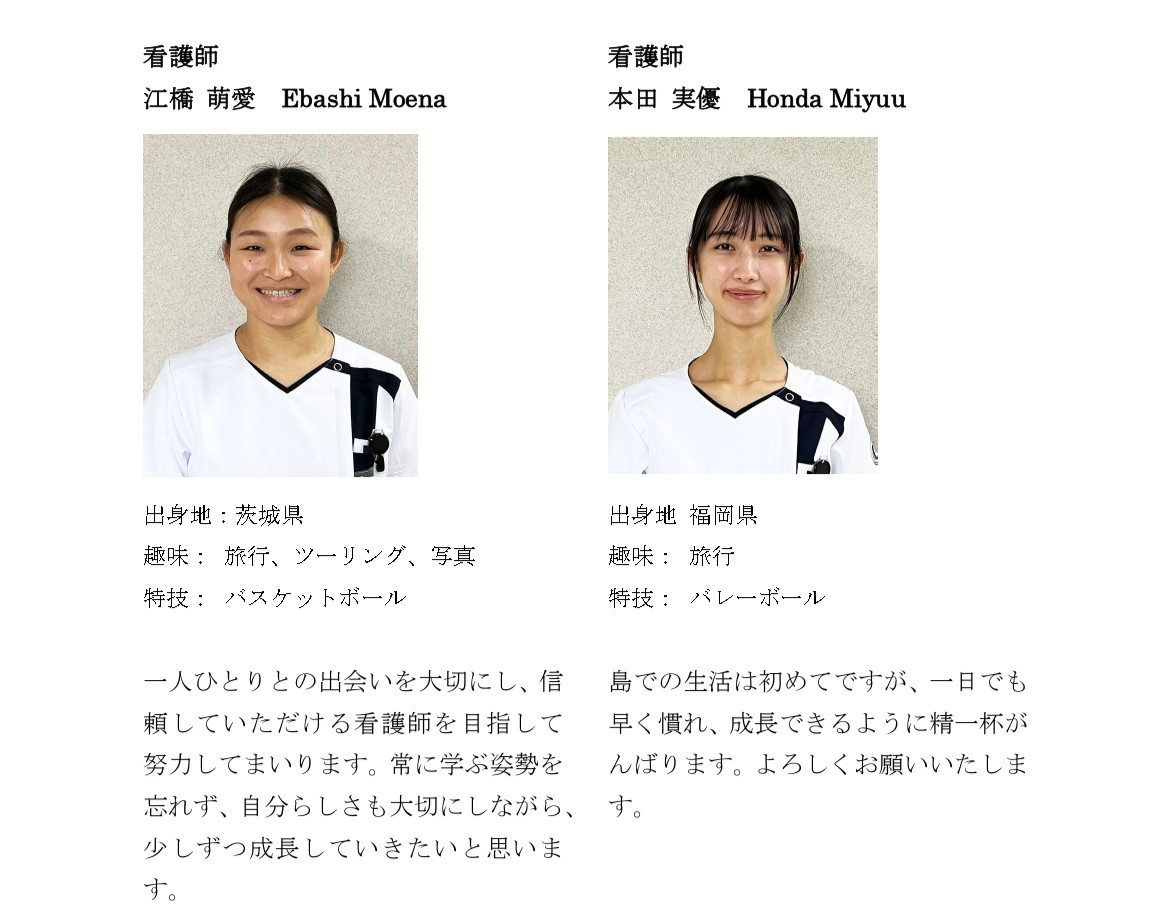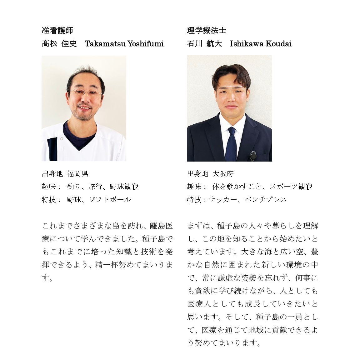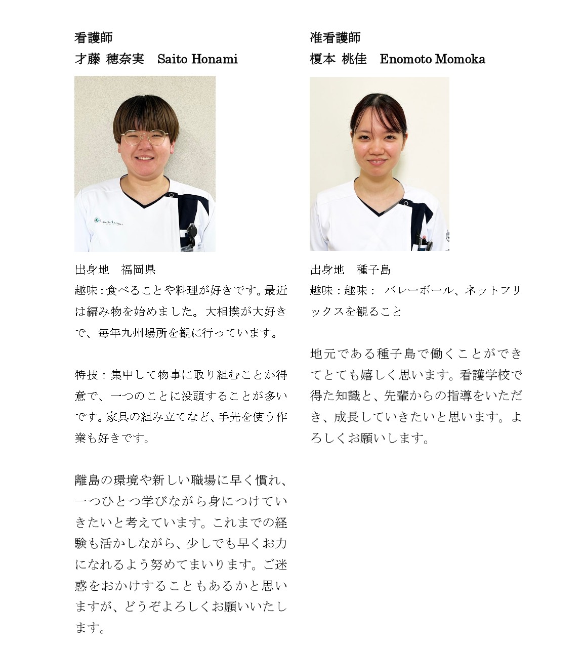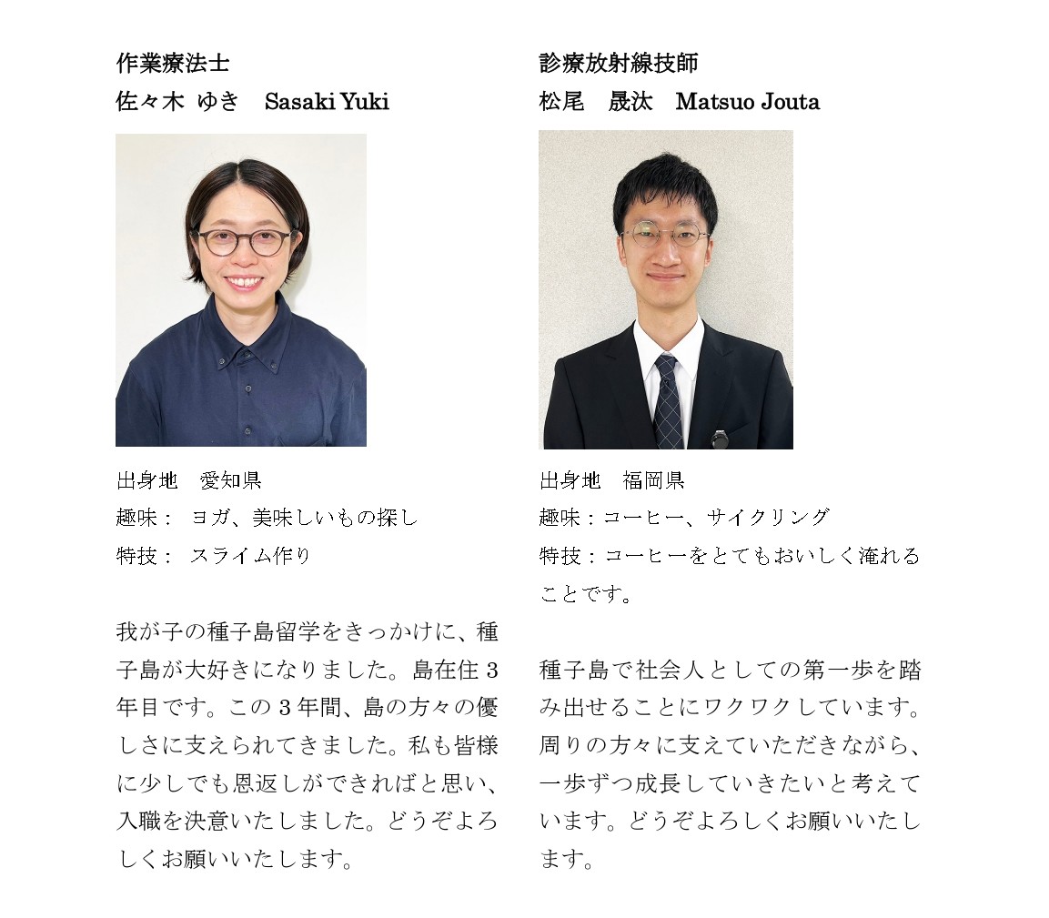 新入職員を紹介します スタッフブログ 2026.04.30 この春、新しく仲間に加わったスタッフをご紹介します。まだ緊張した様子もありますが、少しずつ種子島での生活や職場にも慣れてきました。皆さまに安心していただけるよう努めてまいりますので、どうぞ温かく見守っていただけますと幸いです。