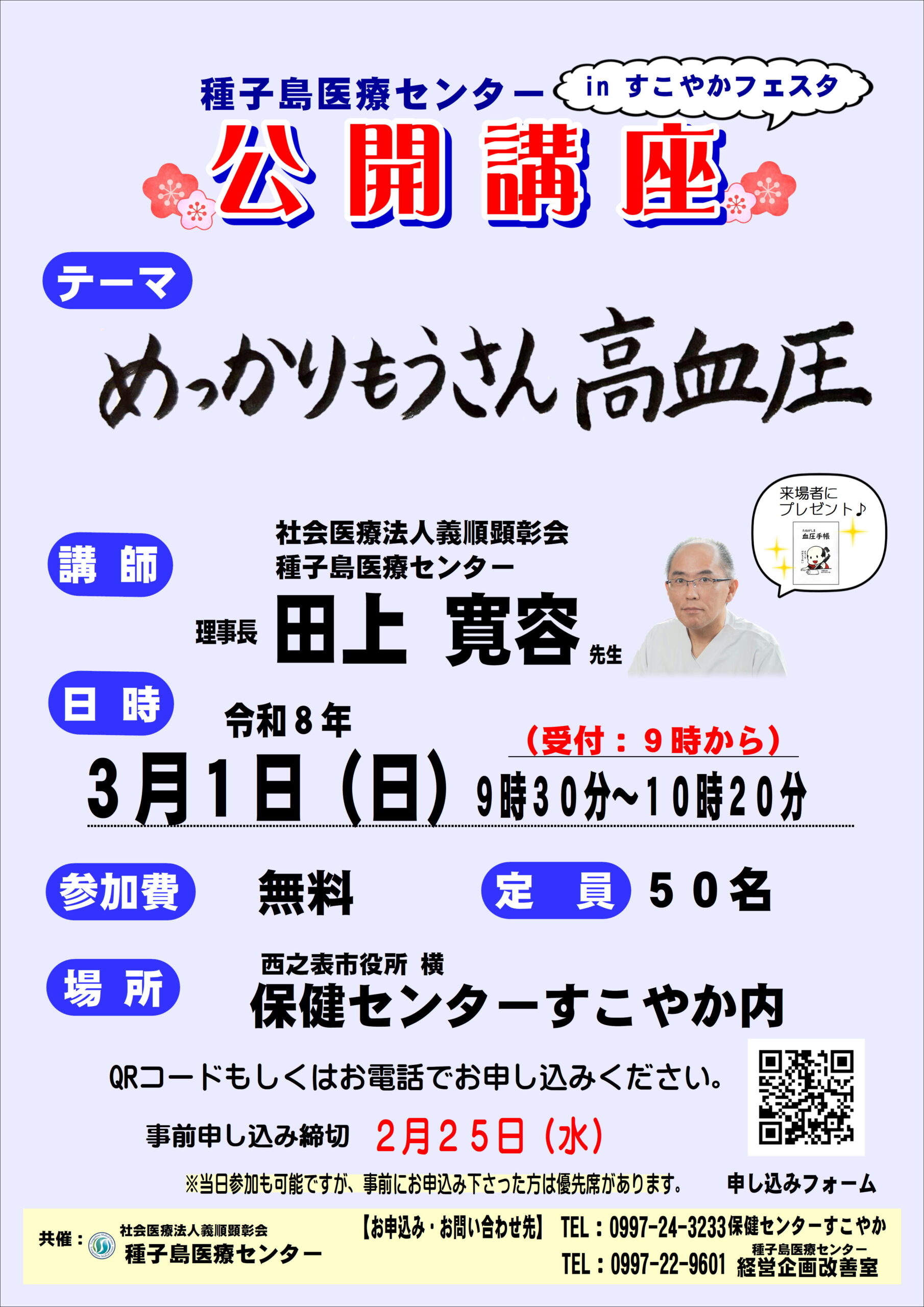 【公開講座】3月1日『めっかりもうさん高血圧』開催のお知らせ NEWS & TOPICS 2026.02.06 こちらをクリックしてお申し込みください 日時: 令和8年3月1日(日)9:30~10:20 会場: 西之表市保険センターすこやか(西之表市役所の隣) 会場定員:50名 テーマ: 『めっかりもうさん高血圧』 当日予約なしでもご参加いただけますが、事前にお申込みいただいた方には優先席をご用意しております。 申し込みは、2月25日(水)まで。上記の申し込みフォームからまたは経営企画改善室までご連絡ください。 種子島医療センター経営企画改善室 担当:河野・原 TEL:0997-22-9601